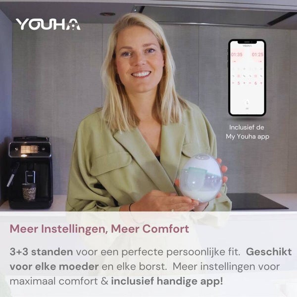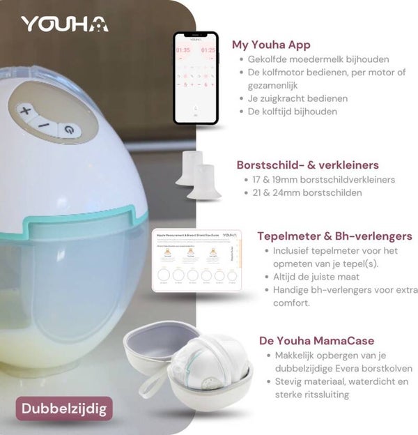 Youha ontwikkelt al jaren top draadloze borstkolven en blijft continu verbeteren op basis van uitgebreide gebruikerservaringen. In de Youha Evera hebben we alle waardevolle feedback uit de afgelopen jaren samengebracht, zoals een betere pasvorm, stiller gebruik, een lichter ontwerp en een duidelijk LED-scherm en zowel handmatig als via de My Youha app te bedienen. Het resultaat is een kolf die comfortabeler, slimmer en effectiever is dan ooit: alles wat moeders nodig hebben in één apparaat.