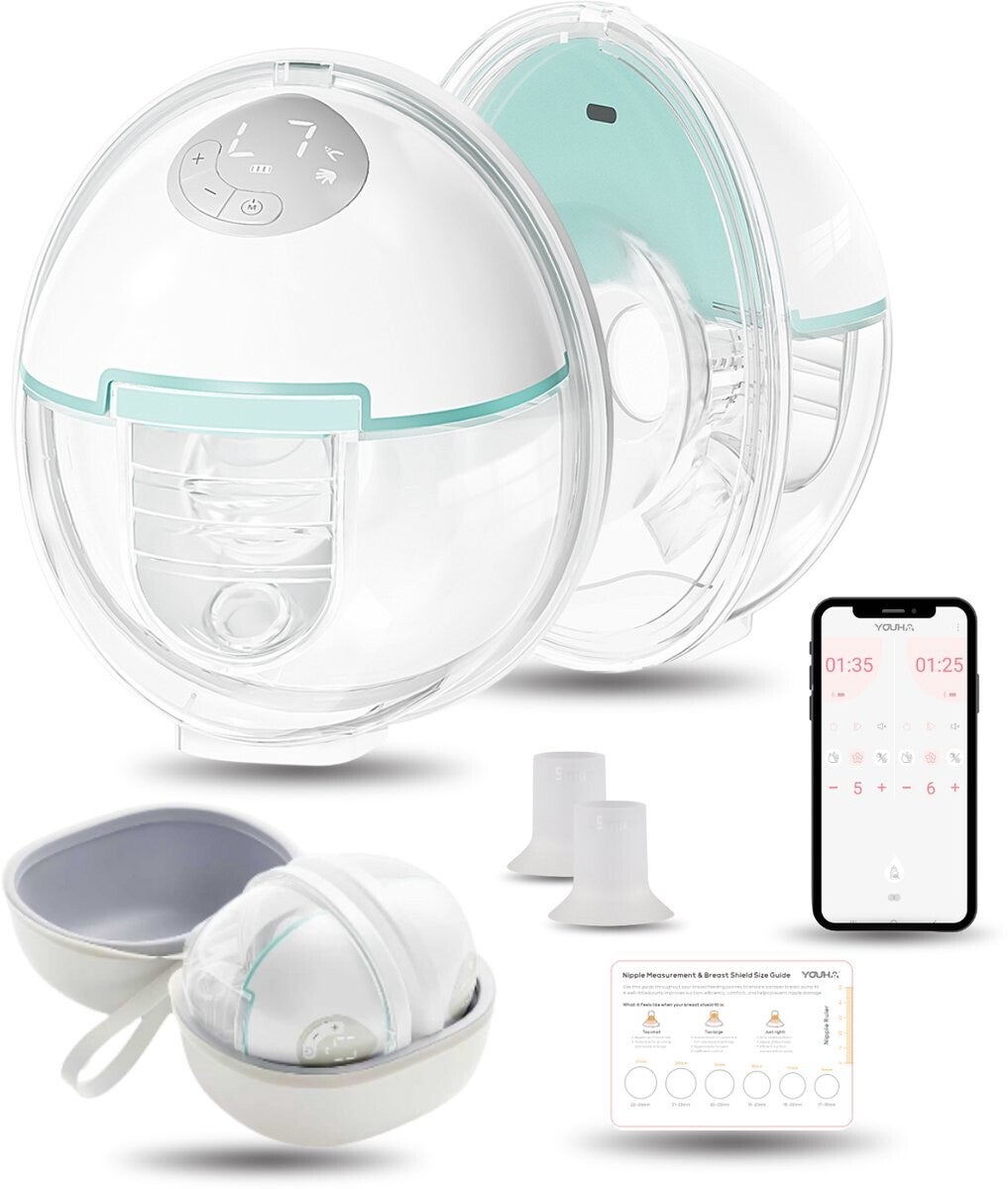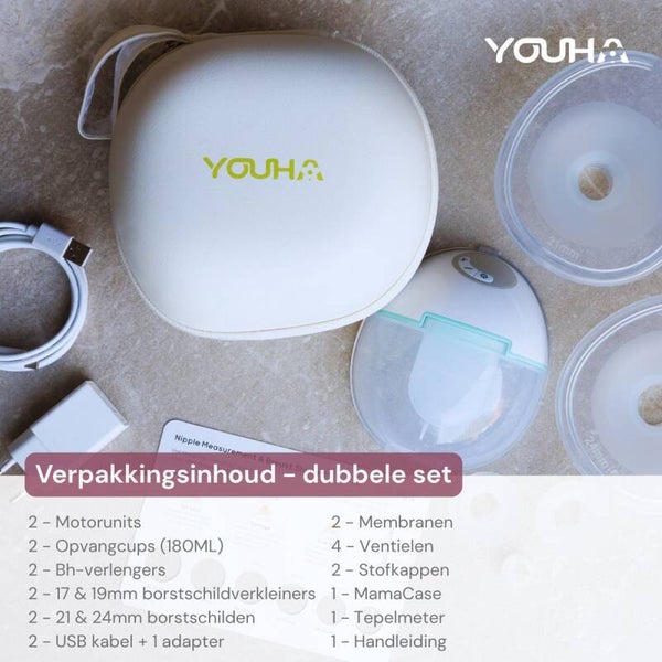 Youha Evera - Dubbele Borstkolf met App & LED-Scherm – Draadloos & Handsfree – 180 ml – Inclusief 17, 19, 21 en 24mm borstschild - Inclusief MamaCase, tepelmeter en bh-verlengers - 6 standen voor elke moeder
