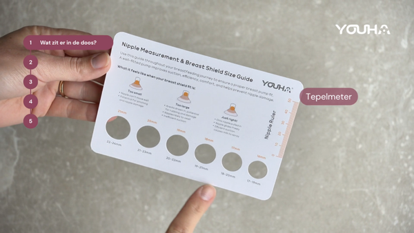 Twijfel je over je maat? Geen probleem, met de meegeleverde tepelmeter bepaal je eenvoudig jouw juiste borstschildmaat. Op die manier kun je direct van start!