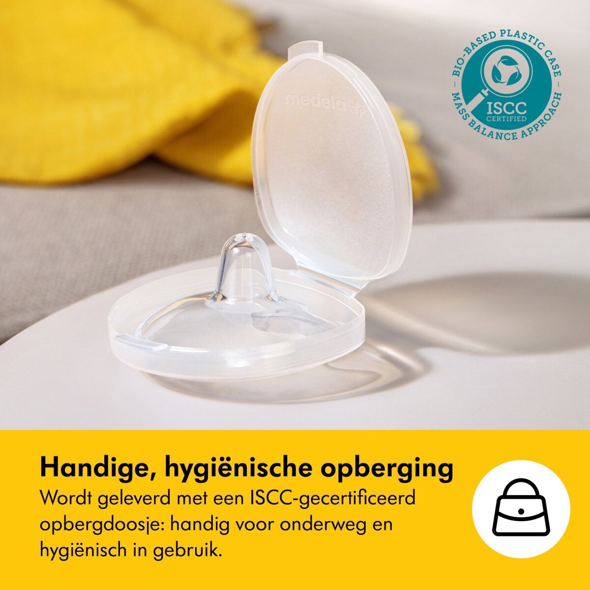 Medela Contact Tepelhoedjes zijn speciaal gemaakt om essentiële ondersteuning te geven aan moeders die borstvoeding geven om uitdagingen bij het aanleggen aan te gaan dankzij hun unieke ontwerp. Door de tepelhoedjes kan de baby de geruststellende geur van mama ruiken en wordt het huid-op-huidcontact gemaximaliseerd, dankzij het doordacht ontworpen, uitgesneden gedeelte. Ze zijn gemaakt van ultradunne, flexibele siliconen en bieden ongeëvenaard comfort, zelfs bij een pijnlijke, droge of gebarsten huid. Compleet met handig opbergdoosje van biobased plastic zijn deze tepelhoedjes de ideale oplossing voor hygiëne en gebruiksgemak onderweg.
