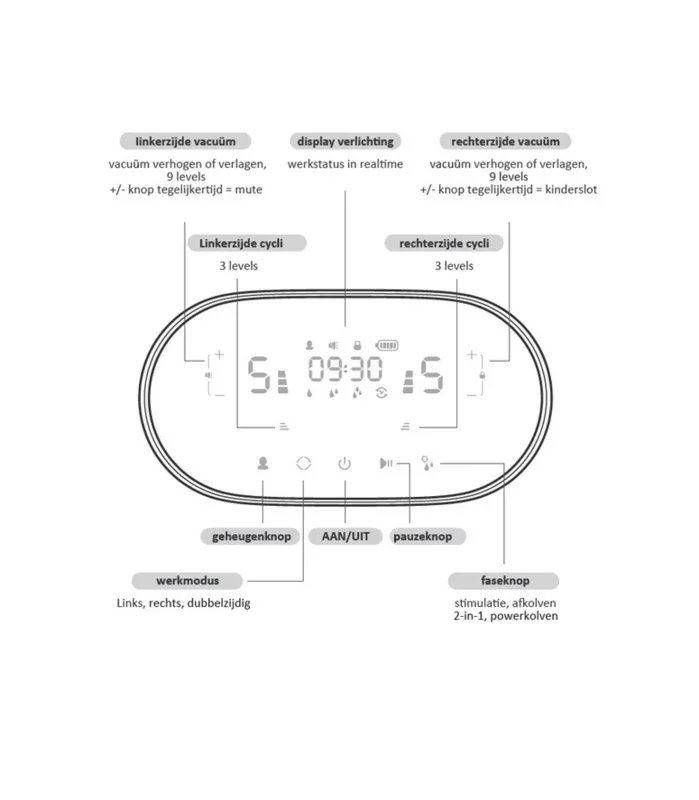 De stimulatiefase masseert de tepel en tepelhof om de toeschietreflex te stimuleren; 9 vacuumniveau's en 3 cycliniveau's.